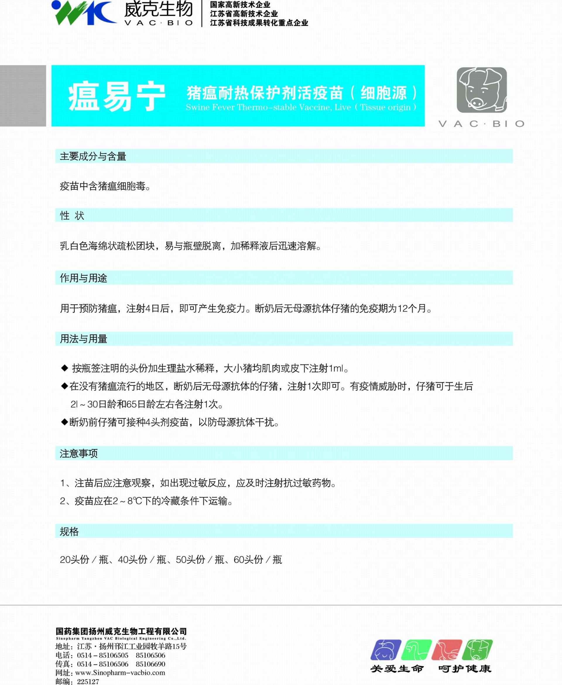 【作用與用途】用于預防豬瘟,注射4日后,即可產生免疫力。斷奶后無母源抗體仔豬的免疫期為12個月