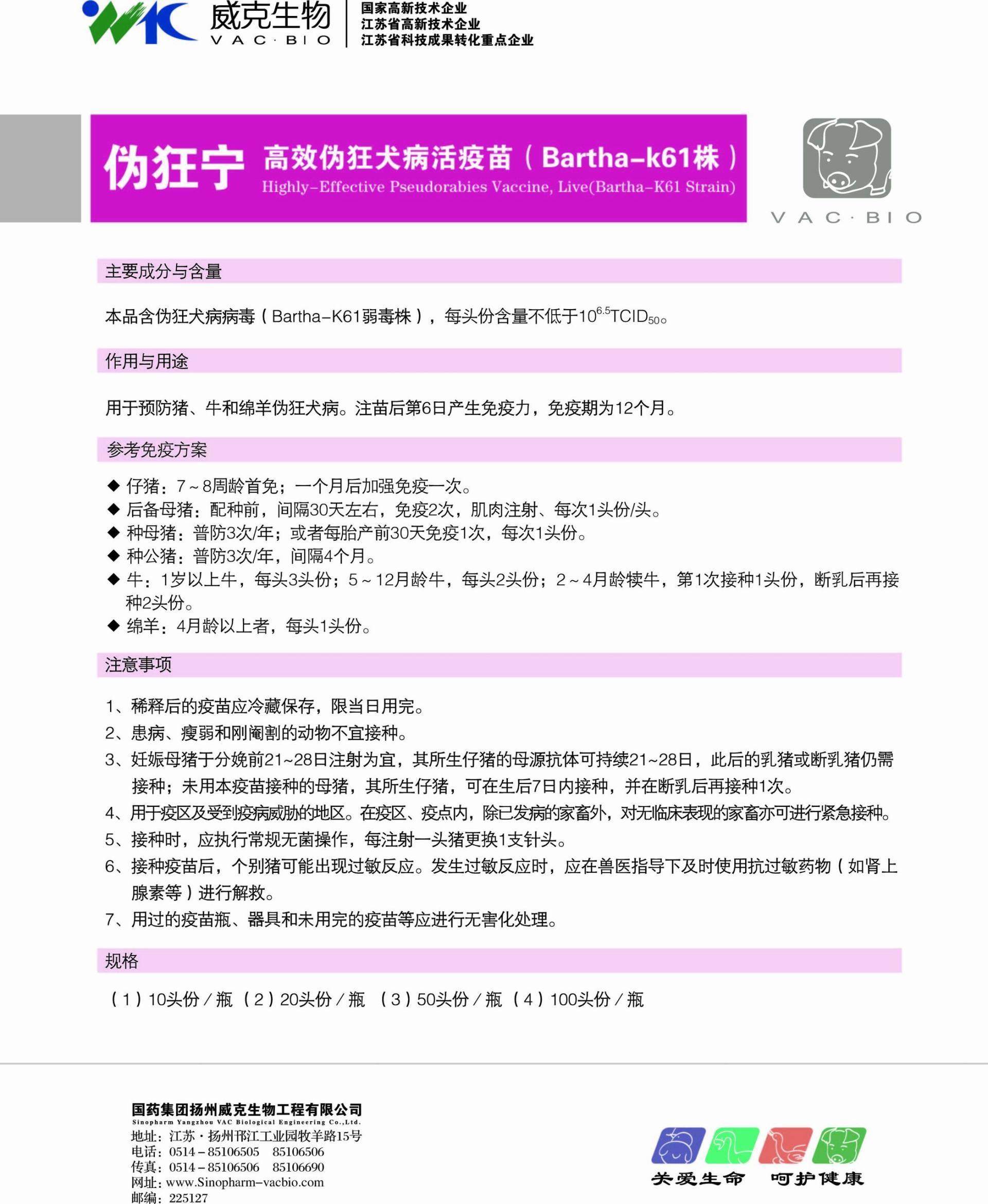 【主要成分與含量】本品含偽狂犬病病毒(Bartha-K61弱毒株),每頭份含量不低于106.5TCID50