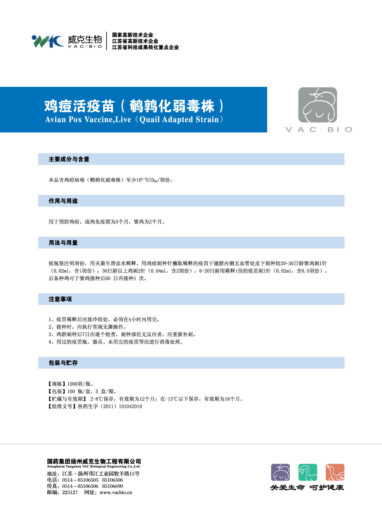 【獸藥名稱】 雞痘活疫苗(鵪鶉化弱毒株)