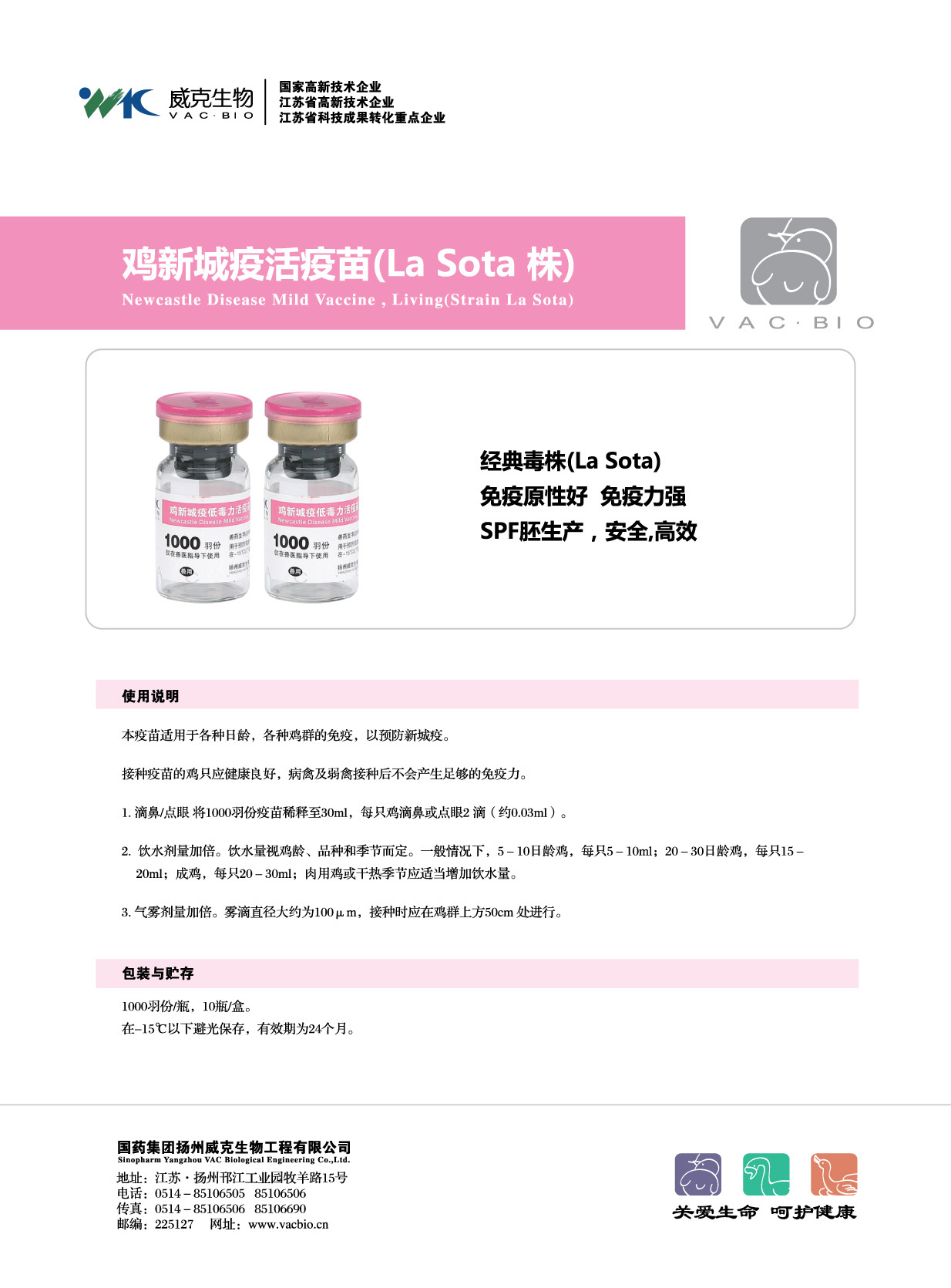 ◆采用國際標(biāo)準(zhǔn)株La sota株,毒力低而穩(wěn)定,免疫原性強(qiáng),能有效防制新城疫的發(fā)生。