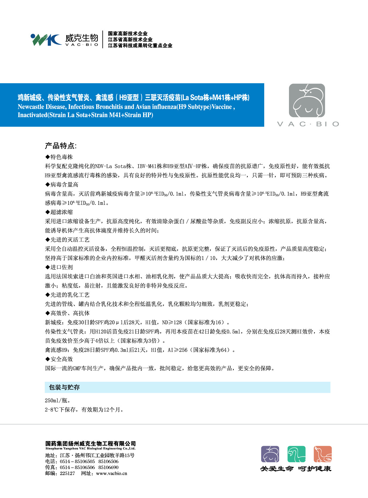 病毒含量高,滅活前雞新城疫病毒含量≥108.5ElD50/0.1ml,傳染性支氣管炎病毒含量≥≥106.5El D50/0.1ml,H9亞型禽流感病毒≥108.5ElD50/0.1ml。