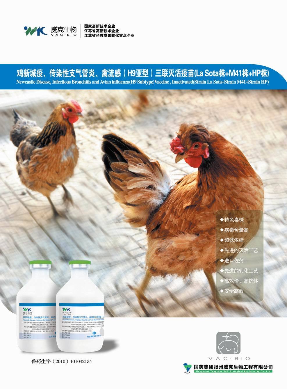 通用名 雞新城疫﹑傳染性支氣管炎﹑禽流感(H9亞型)三聯滅活疫苗 (La Sota株+M41株+HP株)