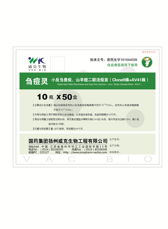 英文名 Peste Des Petits Ruminants and Goat Pox Vaccine,Live(Strain Clone9+ Strain AV41)